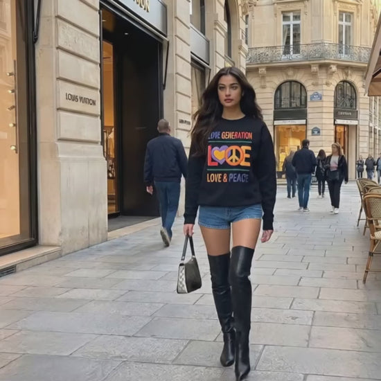 Make a bold statement with this vibrant sweatshirt featuring the iconic words “LOVE GENERATION” and “LOVE AND PEACE” combined with a striking peace symbol.